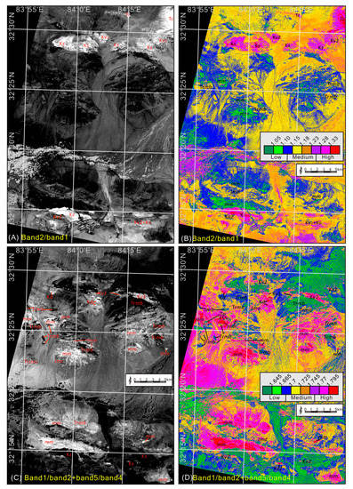 - Watts, D.R.; Harris, N.B. Mapping granite and gneiss in domes along the North Himalayan antiform with ASTER SWIR band ratios. Geol. Soc. Am. Bull. 2005, 117, 879–886. [Google Scholar] [CrossRef]