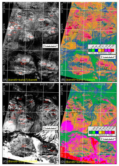Grayscale and classified color images of SWIR indexes. (A,B) Band ratio ; (C,D) Band ratio . See text and Figure 8 for interpretation of the labels of lithologic units.