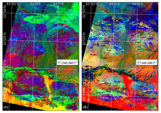 FCC images of the VNIR-SWIR band ratios. (A) Red—, Green—, Blue—; (B) Red—, Green—, Blue—. See text and Figure 8 for interpretation of the labels of lithologic units.