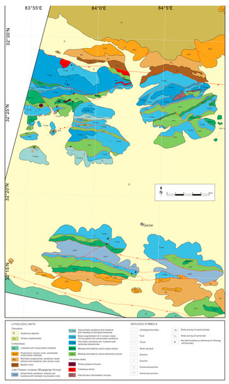 In the process of delineating lithologic boundaries, we followed the rule that the lithologic units are mainly east-west trending, reflecting prominent north-south contractional features [7,11]. Contacts between the MG coherent subunits and the mélanges were all marked as fault boundaries. Offsets of the east-east features (namely lithologic belts and boundaries) along northeast- or northwest-trending lineaments are interpreted as later strike-slip faulting, which is consistent with the Cenozoic deformation pattern in Tibet summarized by [7,52]. The new lithologic map (Figure 13) reaches the scale of 1:50,000 and contains greater details than the previous map (Figure 1A), while the major lithologic boundaries are largely consistent on both maps.