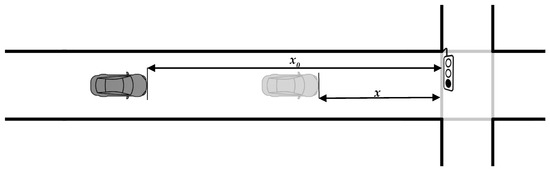The distance between the vehicle and the downstream intersection is denoted by x.