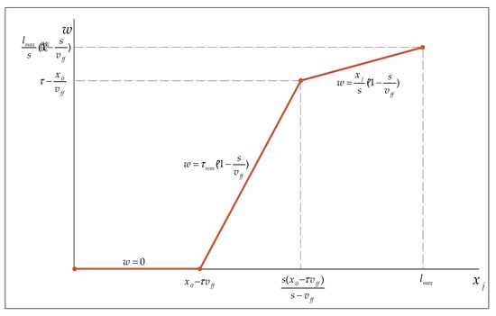 In Equation (8), w is a function of . The location at which a vehicle joins a queue () is a random variable with a determined probability distribution (Equations (8) and (9)). We determined as a function of w so that we could model the PDF of w based on the PDF of . To have as a function of w, Equation (15) is expanded using Equations (13) and (14):