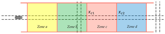 The arterial links are segmented by zones (Figure 6 illustrates an example). The probability of a zone is defined as the probability that a vehicle located at falls into a segment within a zone after prediction horizon τ. It is obvious that the probability of a zone is not a constant quantity, and that its value is dependent on the location () of the vehicle. According to the definition, the probability of a zone (in this case, zone c in Figure 6) is: