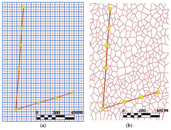 (a) Indicates a 25-m and a 50-m grid; (b) indicates a Voronoi diagram that divides the links into 30- to 100-m segments.
