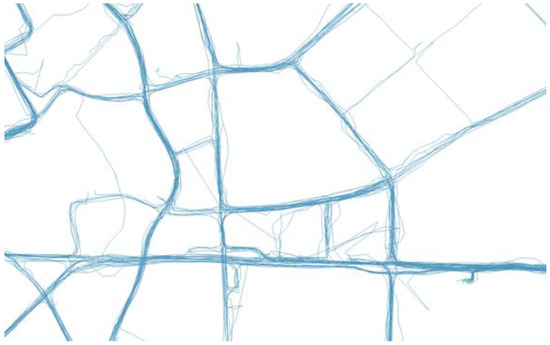 - The trajectory data express the information of road structure. The movement of a typical vehicle is always limited to the existing road network (the vehicle cannot move freely on the plane), so the vehicle trajectory data represent rich road structure information. In Figure 1, many vehicle trajectories are superimposed, roughly delineating the structure of the road network in the area.