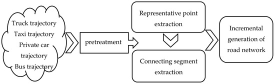 In the following section, the four steps of the proposed algorithm, including trajectory data preprocessing, representative point extraction, connecting segment extraction and road network incremental generation, are described in detail.