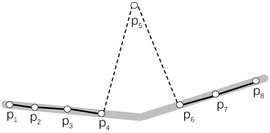 - When a vehicle is driving on the road, the signal of the GPS positioning equipment may be disturbed or interrupted because of the occlusion of trees, high buildings and other objects on both sides of the road, or vehicles entering tunnels, underground parking areas, etc., resulting in the interruption of the vehicle trajectory. Figure 3 depicts an example of such missing points. If p3 and p4 are directly connected, an erroneous trajectory will be formed. This work judges whether there are missing points in trajectory according to the time interval between two adjacent GPS points (), and discards the trajectory of a serious loss [18].
