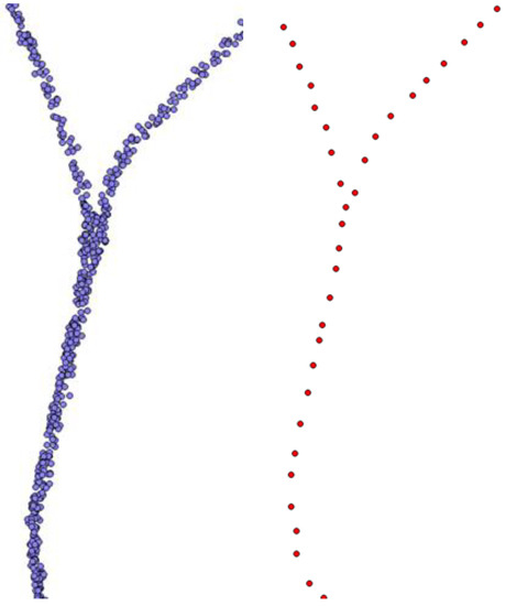 (i) Point clustering assumes that the input is a set of points and clusters the points together through different clustering methods to obtain a road network map [6,7,8,9,10,11]. Representative algorithms in this class include the following. Li et al. [8] proposed the use of spatial-linear clusters to infer road segments from GPS trajectories. Their algorithm can detect missing road and checking the correctness of existing road network through inferring road segments. Edelkamp et al. [9] clustered high precision DGPS trajectories to construct road network, and the center of each cluster is regarded as the lane center line. In [10], GPS points are converted into binary image by morphological operations. Then, the skeleton is extracted to construct road network. Chen et al. [11] proposed a map interface algorithm with accuracy guarantees based on detecting seed elements and connecting them subsequently.