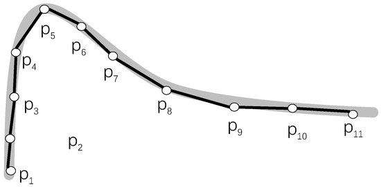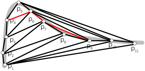 The parameter can be used to control the selection of the interpolation path. When is greater than 1, the path chosen by the algorithm will be biased towards those paths that contain more short segments. The larger is, the more obvious this trend is. Let , the Dijkstra algorithm is applied to search for the shortest path from p4 to p7 and p7 to p9. The result is depicted in the red line in Figure 10. Obviously, the red line segment’s shape conforms to the actual road shape. This result illustrates the feasibility of realizing the interpolation of the connecting segment at the bend by redefining the weight of the Delaunay edge.