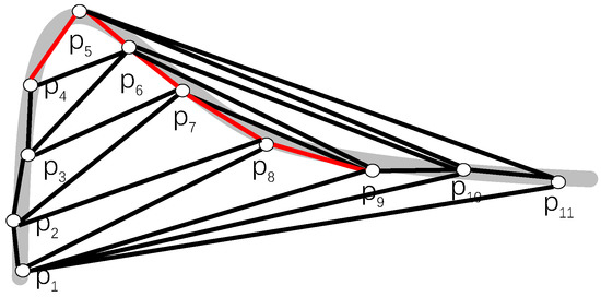 However, using the length of the Delaunay edge directly as the weight of Dijkstra’s algorithm will lead to the interpolation result at the curve not meeting expectations. As depicted in Figure 9, the red line segment in the figure is weighted by the length of the Delaunay edge, the Dijkstra algorithm is used to search for the shortest path from p4 to p7 and p7 to p9. Obviously, due to the neglect of p5 and p8, the resulting shape does not match the shape of the actual road. Generally, in the road generation process, we prefer multiple short lines to a direct long line.