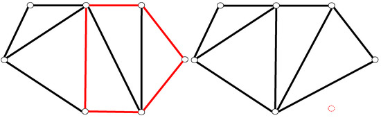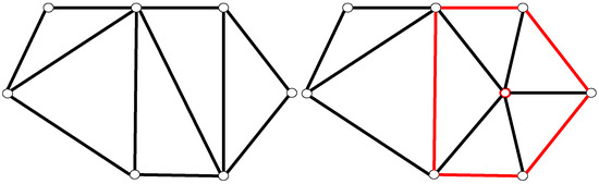 Figure 12 and Figure 13 depict the changes in the Delaunay triangulation caused by the addition and deletion of representative points, respectively [23,24]. Due to the regional of Delaunay triangulation, when adding/deleting a representative point causes the Delaunay triangulation to change, only the part of the connecting segment in the polygon whose structure changes is affected (marked with red line segments). Therefore, whenever the trajectory input changes the structure of the Delaunay triangulation, it is only necessary to re-interpolate the part of the connecting segment, together with the connecting segment extracted from the trajectory, to ensure that the road network through which this trajectory passes is properly updated. Note: The structural changes caused by the location update of the points in the Delaunay triangulation are essential point deletion and point addition processes, which are not discussed.