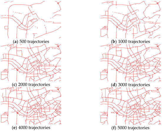 Comparing the graphs in Figure 14, it can be found that, with the continuous input of the vehicle trajectory, the generated road network becomes more and more complicated, and more and more details are presented. With a careful observation of each picture in Figure 14, it is found that there are many “breakpoints” in the road network generated at the beginning, which is because, when the number of trajectories is small, the number of repeated occurrences of some connecting segments is less than . However, it will be filtered when the road network is being generated and will not be displayed for the time being.