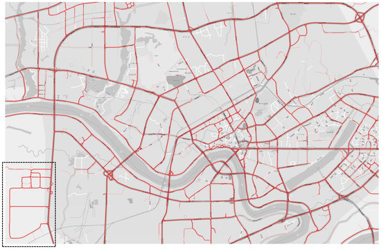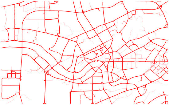 Fewer repeated occurrences of connecting segments does not mean those segments are abnormal. It may be because the number of vehicle trajectories corresponding to the road segment is small. However, in general, the more repeating the line segment is, the less likely it is an abnormal line segment. Therefore, according to the user’s accuracy requirements for the road network, the corresponding can be set. Figure 15 divides the number of repeated occurrences of the connecting segment by the thickness of the line segment, and divides the number of occurrences of the connecting segment into four steps according to 1–3 times, 4–6 times, 7–9 times, and ≥10 times, and draws from thin to coarse together on the same picture. In Figure 15, the influence of on the coverage of the generated road network can be visually seen. The higher is the , the higher is the accuracy of the obtained road network, while the smaller is the coverage range.