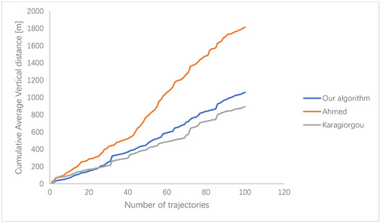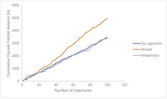 Karagiorgou et al. [16] used random sets of shortest paths to quantitatively measure the quality of the resulting road network. Their evaluation process can be summarized in three steps. In the first step, a ground-truth network is derived using the tracking data as a filter. The second step randomly selects the same set of origin and destination nodes and compute the respective shortest paths in ground-truth network and generated network. Finally, in step three, the Discrete Fréchet distance and the Average Vertical distance are used to compare the shortest paths. We used their method to quantitatively evaluate our algorithm and compared it to Ahmed’s [14] and Karagiorgou’s [16] algorithms, which have public realization on the Internet (https://github.com/pfoser/mapconstruction). Because our dataset has no ground truth, we chose Chicago dataset (provided by Biagioni and Eriksson [25,26], it contains 888 trajectories, and 119,360 GPS points) to compare the accuracy and speed of the three algorithms. We computed a set of 100 random shortest paths with origin and destination nodes uniformly distributed over the maps and compared the paths using the Discrete Fréchet distance and the Average Vertical distance measure. The results are shown in Figure 18 and Figure 19. We also list the execution time of these three algorithms in Table 1. Our algorithm has similar Discrete Fréchet distance but a little bigger Average Vertical distance compared to Karagiorgou’s algorithm which means Karagiorgou’s algorithm has higher accuracy. However, Karagiorgou’s algorithm is about 120 times slower than our method. Ahmed’s algorithm is a little bit faster than ours, as shown in Table 1, but its Discrete Fréchet distance and Average Vertical distance is much bigger than ours. We believe our algorithms has a better tradeoff between efficiency and accuracy.