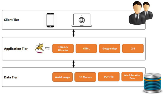 According to Figure 3, this architecture has three sections. The data tier, application tier, and client tier. Data tier includes 3D models, a subdivision plan (a PDF file), an aerial imagery and administrative information including ownership, plan number and owner’s corporation schedule. The application tier is responsible for publishing the 3D cadastral data in this prototype using Three.JS libraries, and Apache Tomcat.