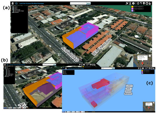 (a) A snapshot of the prototype (www.spear.land.vic.gov.au/spear/pages/eplan/3d-digital-cadastre/3dprototype/prototype.html). (b) A combined visualization of the building (physical and legal view). (c) Search of a lot within the building displaying an apartment unit and its car park.