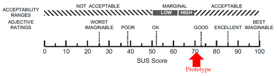 The overall SUS score was calculated as 70.44 out of 100. According to the rule-of-thumb standard, the so-called ‘university grade analog’, discussed by Bangor et al. [41] and illustrated in Figure 5, the SUS score is between ‘OK’ and ‘GOOD’ ratings, among ‘worst imaginable’, ‘poor’, ‘ok’, ‘good’, ‘excellent’, and ‘best imaginable’ ratings.