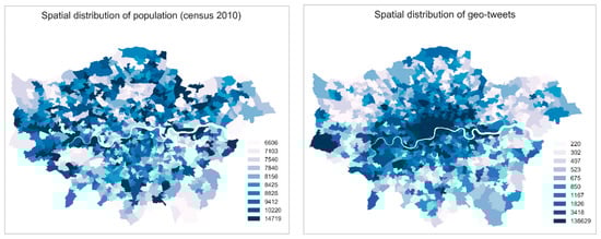 Spatial distribution of population (left) and geo-tweets in zones (right).