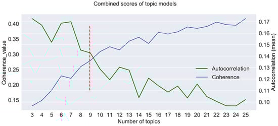 The optimal topic model was selected with nine topics identified using coherence values and an average spatial autocorrelation measure. In general, the coherence values increased along with the number of topics as aforementioned. The result is in line with that in the data mining literature [49]. Conversely, the mean value of spatial autocorrelation decreased. This indicates the spatial distribution is exhibiting higher levels of randomness, which makes the classification and interpretation of topics more complicated when considering its associated spatial patterns. Therefore, topic model with nine topics was selected as shown in Figure 3 (vertical line) as a trade-off between coherence and autocorrelation values.