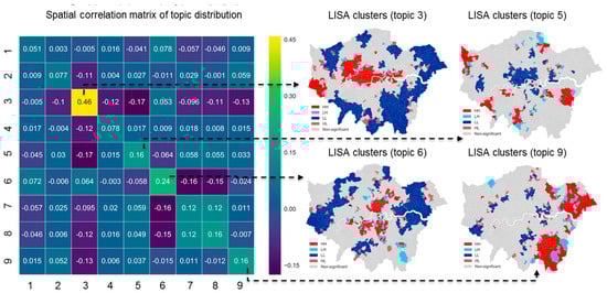 In the second step, spatial correlation analysis was applied. A spatial weight matrix was constructed using a K nearest neighborhood (KNN) method with K set to be 10. Our experiment showed that choices of alternative K would only smooth the spatial distribution to a certain degree, but it made no dramatic change to the observed overall trend. Noting that the index of the matrix in Figure 4 corresponds to the identification of topics in Table 2 we see that the non-diagonal cells are bivariate spatial correlation of two different topics. A higher value means the distribution of the two topics is likely to change accordingly in space. Overall, low bivariate correlations were observed, which is indicative of a spatially stable classification of topics.