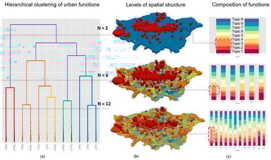 Building on the foregoing analysis, the final step explores whether we can construct a clear spatial structure from the topics and functions. Considering the entangled urban functions, we adopted the distribution of topics instead of one dominance topic as a descriptor of zones. Agglomerative clustering is applied to generate a hierarchical structure using distributions as input features. In theory, the higher-level branches indicate higher-level partitions of space. The zones with similar feature will be clustered. Moreover, no spatial constraints were added to the clustering process, as we would like to know, whether the generated clusters embed spatial patterns in their nature, and whether the geographical mapping of clusters would demonstrate any underlying correlations with known urban theories or models (e.g., central place theory).