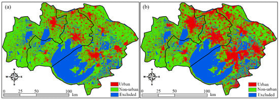 The urban patterns in 2005 and 2015 classified using Landsat images. (a) Urban pattern in 2005, and (b) Urban pattern in 2015.