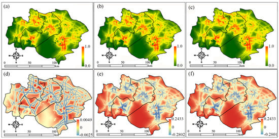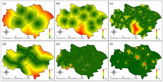 Land transition probability maps for scenario prediction based on CG and SPG. (a) Land transition probability by CG for COUNTY-scenario, (b) Land transition probability by CG for ROAD-scenario, (c) Land transition probability by CG for POP-scenario, (d) Land transition probability by SPG for COUNTY-scenario, (e) Land transition probability by SPG for ROAD-scenario, and (f) Land transition probability by SPG for POP-scenario.