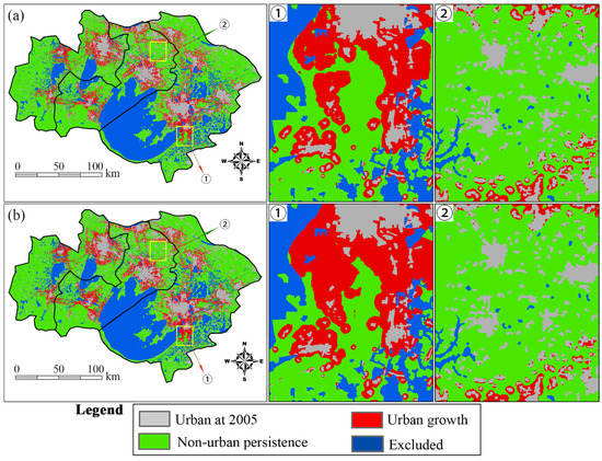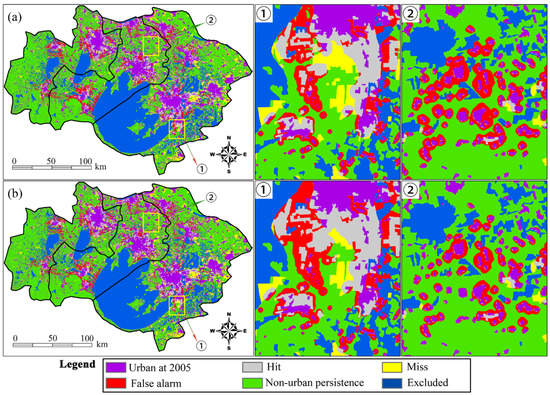 Model assessment (validation) is crucial to urban growth modeling because it reports how well the proposed CA models perform and how well the simulations match the actual urban patterns. The land transition probability maps are commonly assessed using fitting statistics, the relative operating characteristic, and the total operating characteristic [,]. The simulation results are usually assessed based on a confusion matrix that is derived from cell-by-cell comparison between observed and simulated urban patterns. We applied six indices: overall accuracy and standard Kappa derived from the confusion matrix, correct rejection, hit, miss, and false alarm calculated from an overlaying map of reference and simulated urban growth patterns [,]. Overall accuracy represents the match between the reference and simulated maps in proportion to the total cells [], indicating the overall performance of the CA models in this research. Kappa is a statistic that measures the inter-rater agreement between the reference and simulated maps, with attention given to the possibility of chance agreement []. Correct rejection represents the areas that are persistent non-urban cells in both the reference and simulated maps; hit represents the areas that are urban growth cells in both the reference and simulated maps; miss represents the areas that are urban growth cells in the reference map but persistent non-urban cells in the simulated map; and false alarm represents areas that are persistently non-urban in the reference map but urban growth cells in the simulated map. The sum of miss and false alarm is the total error of the simulation.