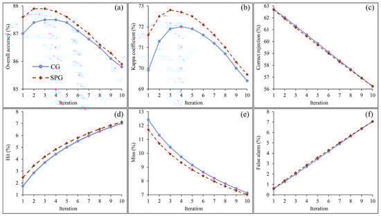 Changes in simulation success and error during the simulation. (a) Overall accuracy, (b) kappa coefficient, (c) correct rejection, (d) hit, (e) miss, and (f) false alarm.