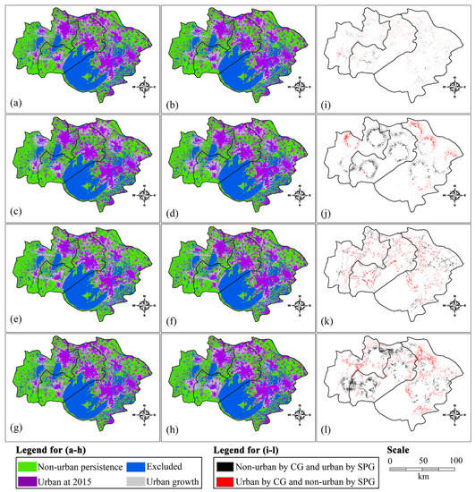 Urban scenarios for 2035 predicted using both the CG-CA and SPG-CA models. (a) BUA-scenario by CG-CA, (b) BUA-scenario by SPG-CA, (c) COUNTY-scenario by CG-CA, (d) COUNTY-scenario by SPG-CA, (e) ROAD-scenario by CG-CA, (f) ROAD-scenario by SPG-CA, (g) POP-scenario by CG-CA, (h) POP-scenario by SPG-CA, (i) comparison of BAU-scenarios between CG and SPG, (j) comparison of COUNTY-scenarios between CG and SPG, (k) comparison of ROAD-scenarios between CG and SPG, and (l) comparison of POP-scenarios between CG and SPG.
