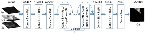 The CNN optical generation network is illustrated in Figure 2. The network consists of nine ResNets blocks and six non-ResNets blocks. Excluding the last layer, non-ResNets convolutional layers are composed with Conv(convolution)-BN-ReLu. The BN layer is used for the reason of avoiding the gradient vanishing and divergence issue. ReLu is to increase the nonlinearity of the network. The last layer consists of conv-tanh, which can help to ensure that the output image has pixels in the scale range as reported in the reference [17]. In Figure 2, n64k7 means the corresponding number of output features is 64 and the kernel size is . Except the first layer which uses kernels, the convolutional layers adopts kernels. The input image is of size (e.g., for Task A when dual-polarimetric channels are used; for Task B when bi-temporal dual-polarimetric channels and four spectral bands are used), and the output image is of size . ResNets have been demonstrated to be very useful in the restoration task [14]. However, ResNets identify network by shortcut, which is inconsistent with our generator network (the features of input is not equal to that of output). In the first three layers, the features rise to 256 dimensions, followed by nine ResNets blocks. Each ResNets block layer is completed by the modules of the form Conv-BN-ReLu-Drop-Conv-ReLu [18]. Here, “Drop” stands for dropout and is adopted to increase the robustness of the network. In this case, the ResNets are used in the 256 feature space, and concluded by three layers to reduce the feature dimension to 4. To keep the spatial size of input and output images, the pooling step is left out and the stride size is set as 1. We used zero-padding to make up for the spatial size reduction cased by the convolution kernels.