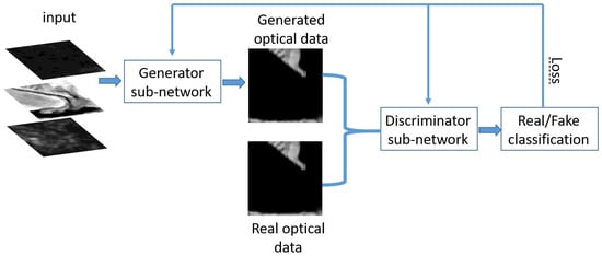 The cGAN network requires the simultaneous training of generative and discriminative networks. As stated in the preceding section, the generator produces a fake image from the input data, and the discriminator tries to classify the input-fake pair and input-real pair. The discriminator is first trained to improve the classification accuracy. A trained discriminator is then used to train the generative network. The process alternates until the end. The flowchart of the proposed cGAN is presented in Figure 3. The CNN model (described in Section 2.2) is regarded as the generative sub-network and incorporated in an adversarial framework, regularized by a discriminative sub-network.