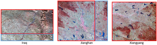 O2 images of Iraq, Jianghan and Xiangyang pairs. The training patches are selected from the red rectangle and the test patches are from the blue area.