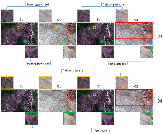 The images were segmented into non-overlapping patch pairs of spatial size . The training data were then selected from the area inside the red rectangle, and the test data from the blue ones. Figure 6 illustrates the training and test patch pairs generation with the Iraq dataset. The purpose of Task A and Task B is to simulate the blue rectangle area of O2 image. For Task A, the image patch pair consists of two patches cropped from the same location of S1-O1 or S2-O2 images. Since Task A only needs SAR image to generate the optical image, the patch pairs from the blue rectangle are adopted as test samples, and the rest are regarded as training samples, as presented in Figure 6a. For Task B, each patch set consists of four patches cropped from the same area of S1, O1, S2 and O2. Task B needs S1, O1 and S2 as input, and O2 as output. Examples of training and test patch sets are presented in Figure 6b. The number of training and test patch sets of Task B are summarized in Table 2. Models specific to each test area were designed according to the respective training dataset as per the details given below.
