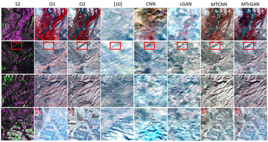 Figure 7 shows several patches of input S2 and O1, and output reference O2, compared with our optical image simulation results. In Figure 7, MTCNN and MTcGAN demonstrate much better results than that of CNN and cGAN from a visual perspective. In fact, SAR image and optical image being totally different from each other, it is extremely difficult to learn a mapping between the two. The optical simulation results of Task A and method [10] presented in Figure 7 are hence blurred, and we can not distinguish objects from these simulated images. However, with multi-temporal fusion based optical simulation of Task B, one can learn the changed information between S1 and S2, and then accordingly reconstruct the change on the basis of O1 image. As illustrated in the red rectangle of Figure 7, one can see that a change has happened between O1 and O2. Our goal is to pass this change from the SAR image to the optical image, and then reconstruct the same in the simulated O2 image. Following this strategy, the complexity of Task B can be significantly reduced, and the optical image can thus be successfully simulated.