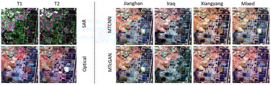 Case (2) The purpose of the second experimental study is to investigate the influence of different training sets for the final optical image simulation. The test patches were taken from Jianghan image. In this case, we performed only Task B, and train MTCNN and MTcGAN models with four different training sets. For the first three sets, the samples were selected from the training parts of the Jianghan, Iraq, and Xiangyang images, respectively. In this case, the simulated optical images of MTCNN and MTcGAN methods can be with different training sets. We also added the whole training patches together to formulate the final training set, denoted as “Mixed”.