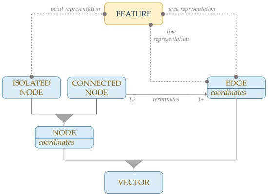 As defined by the IHO standard, the S-57 data content consists of a set of features that may have a spatial representation in the form of points, lines or polygons. Based on the ENC product specifications, those features must be encoded using the chain-node topology, as shown in Figure 1 [32,34]. For an S-57 ENC, the basic unit of geographic coverage is called “cell”, normally a spherical rectangle bordered by meridians and latitudes with actual data coverage of any shape [31]. Within the same navigational purpose (e.g., coastal, approach), see Table 1, the cell data may not overlap with those of the adjacent cells. The navigational purpose also drives the compilation scale and, thus, the features contained in a cell.
