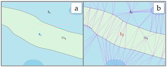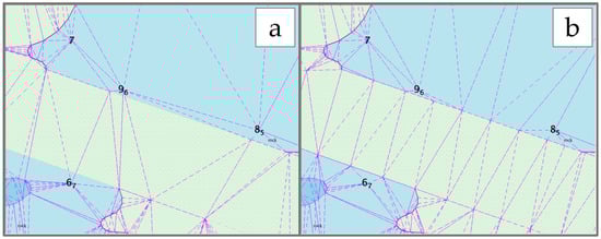 Pane (a) shows an example retrieved from an ENC where the long sides of a dredged-area feature (visualized with a dotted pattern) trigger the creation of triangles (dashed magenta lines) that overlap with the same feature edges. After the application of the proposed interpolation criterion, the resulting triangulation shown in pane (b) does not present the overlap issue.
