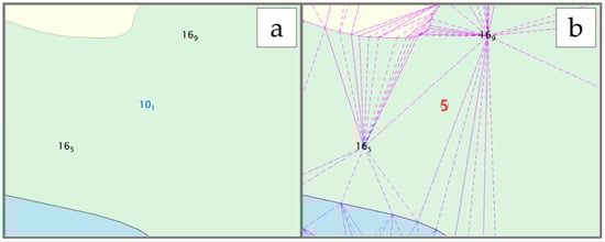 The algorithm retrieves the for (1) directly from the ENC, using the value stored in the “Compilation Scale of Data” (S-57 label: CSCL) subfield in the “Data Set Parameter” (S-57 field tag: DSPM) field structure [32]. By definition, such a value represents the compilation scale appropriate to the greater part of the data in the cell [32]. The derivation of the interpolation factor, , from the ENC analysis (i.e., by looking at the distribution of the distance among the features) was attempted, but it did not provide satisfying results, mainly because of the intrinsic variable-resolution nature of a nautical chart. The 1-cm interpolation value was then established heuristically as a trade-off value between the requirement of avoiding the triangle-crossing-edge condition and the performance cost paid for a larger point cloud to triangulate. The effectiveness of has been empirically tested using real-world ENCs, but more conservative values for —or its derivation from more advanced ENC analysis (e.g., locally estimating rather than attempting to define a single value for the full chart)—may be adopted.