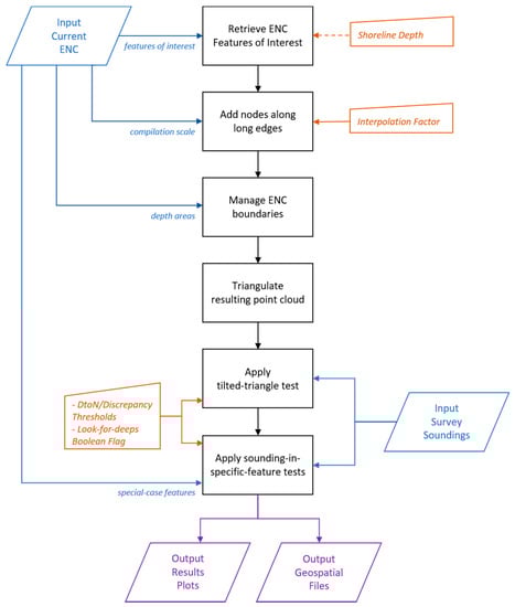 Figure 6 provides a flowchart outlining the main algorithmic steps, data inputs, user parameters, and processing outputs. The plots provided in the output should only be used for exploratory means. In fact, once the algorithm is successfully executed, the generated geospatial files should be imported in the fully-fledged GIS application of choice for results inspection and eventual application of the required modifications to the ENC.