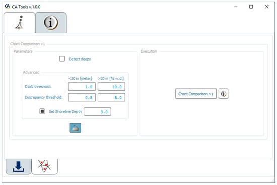 Optional output in the popular Shapefile and KML formats are generated using the Geospatial Data Abstraction Library (GDAL) package [51]. In this latter case, the TIN internally used by the algorithm is also generated for debugging aims. An implementation of the algorithm was made publicly available in the HydrOffice framework as a tab widget, see Figure 7, freely accessible in the CA Tools application (https://www.hydroffice.org/catools).