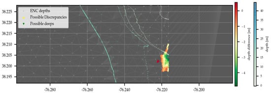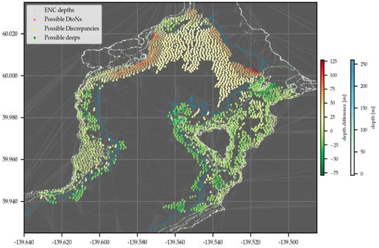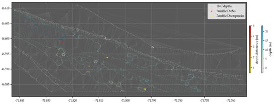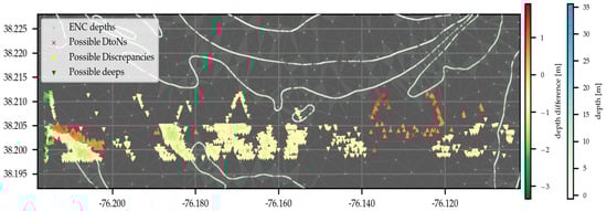 The algorithm uses the to evaluate whether flagging the soundings as DtoN candidates, see Figure 4, or potential chart discrepancies. The default logic of the applied thresholding, see Table 2, is derived from the NOAA Office of Coast Survey (OCS) Hydrographic Surveys Specifications and Deliverables (HSSD) manual [43]. In deep waters, the DtoN concept does not apply to surface navigation. However, based on the consideration that the presence of a very large discrepancy in comparison to the charted water depth may represent an issue for specific marine operations (e.g., towing a side scan sonar), the algorithm reports—when using default parameters—potential DtoNs for values larger than 10% of the water depth. However, since these values should follow the specific policy (or other types of specific needs) of the adopting cartographic organization, while the current ones are inspired by best practices in [43], the algorithm was made flexible to accept customized threshold values as input parameters.