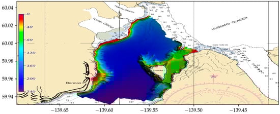 Bathymetric model generated using the data collected by the NOAA H13071 survey. The NOAA raster nautical charts 16761 (Yakutat Bay) is shown in the background. Bathymetric values in the color bar (in blue) are in meters and referred to the Mean Lower Low Water (MLLW) vertical datum. Axes in geographical WGS84 coordinates.