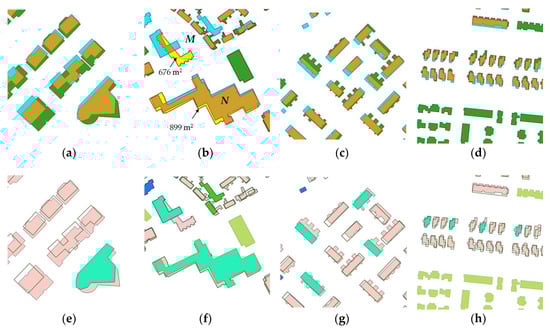On the other hand, the blue buildings in alignment in Figure 14d,e were not corrected in this procedure because their parts significantly exceeded the criteria. Consequently, they stayed as ‘changed’. Although experts labelled the two cases as ‘unchanged’ (they said that the differences were the result of different specifications), they agreed that the situations are highly uncertain, and hence their reference value should be taken with care. Thus, we tried not to overanalyze this aspect.