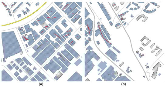 Identified corresponding buildings in OSM (filled with hash lines) and TOP10NL (blue) in (a) industrial area and (b) its outskirt: 1-to-1 and m-to-n relations are visualized by red links, and 1-to-0 and 0-to-1 relations are those without a link.