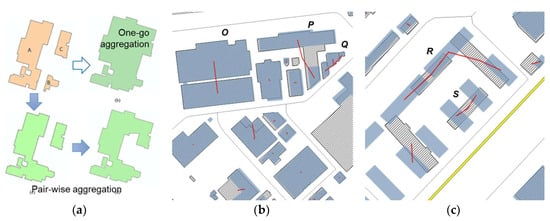 where {oi} is either the m or n part in the m-to-n relation. If AggRatio ≥ Tagg_ratio (threshold for aggregation ratio), we stopped the aggregation as well as the subsequent shape analysis. The buildings in the relation were then marked ‘changed’. For example, P, R, and S in Figure 3 are situations where the aggregation could have enclosed too much empty space (e.g., Tagg_ratio = 0.2), indicating that they are situations where changes may occur. If the two buildings in P are aggregated, the shape comparison would lead to a conclusion that it had not changed. Finally, if the aggregation passes the post-evaluation, the m-to-n relation becomes a 1-to-1 relation and proceeds with the subsequent comparison.