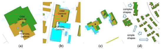 Offset is calculated as the distance between building centroids. To determine if a building in the corresponding relationship has a simple shape or not, we firstly simplified OSM buildings with a parameter suitable for TOP10NL, for example, we simplified intrusions and protrusions smaller than 5 m (Figure 4c), and then we calculated the convex hull of the simplified building. If the condition Area(simplified building)/Area(convex hull) ≥ 0.9 holds for both buildings in a corresponding relation, meaning that they are very similar to a rectangle, then we moved the two buildings so that their centroids aligned before the subsequent analysis. After the alignment, the difference parts A-B, B-A, and A∩B were re-generated.