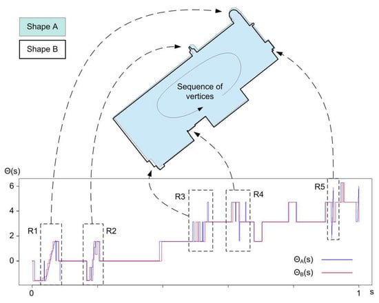 For any polygon, the turning function Θ(s) describes the variation in the tangent-angle of its outline (in radians) in relation to the normalized arc-length s (e.g., ΘA(s) and ΘB(s) in Figure 5), where s ∈ [0, 1] is any point along the polygon outline and when s = {0,1}, it is situated on the start/end vertex. The distance dA,B(t,θ) is the turning function similarity between A and B. For more details, please refer to previously published reports [26,27].