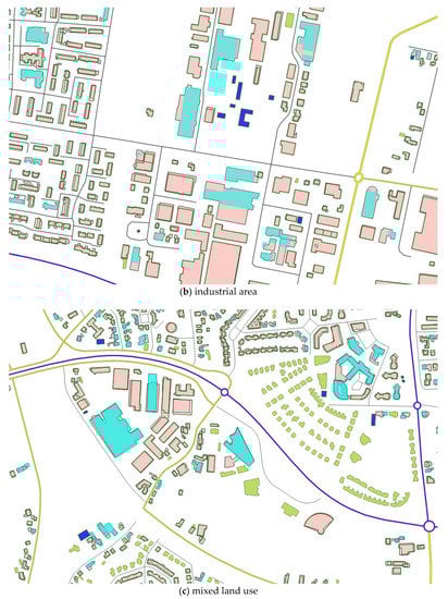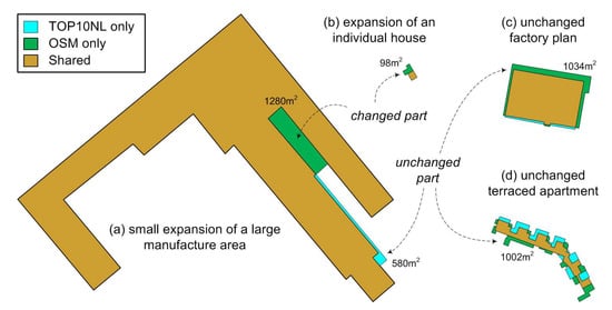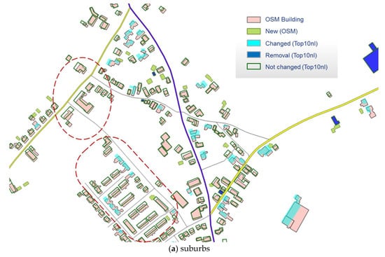 Results obtained by our rule-based approach in (a) suburban, (b) industrial areas, and an area of mixed land use (TOP10NL is superimposed on OSM data; the status ‘Changed’ indicates that the buildings were modified in part).