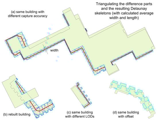 With skeletons and triangles, we were able to characterize the shape of the part. For example, the skeleton reflects the length (Lskeleton) along the stretch of the polygon (Figure 7a–c). With the triangles aligned along the skeleton, we calculated the average width (Wskeleton) [33]. The width of the difference is important for distinguishing changes from non-changes. If it is wider than the threshold (Twidth), the difference part is regarded to be significant enough for a change. For example, Figure 6a and Figure 7b are regarded as changed. The elongation ratio as given below is also useful for characterizing if the difference is belt-shaped (if it is smaller than Telong_ratio). We observed that if the difference part was a thin belt shape, for example, Figure 6c and Figure 7a,c, the object was also untouched.